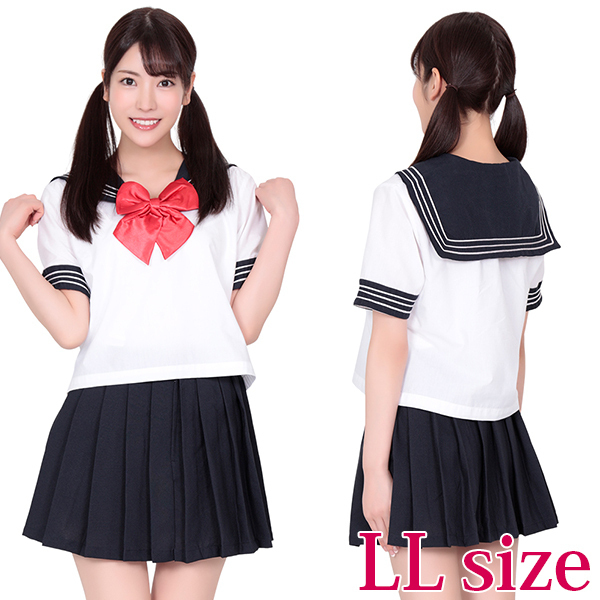 大きな赤色のリボンが、とてもよく目立つセーラー服。リボン付ブラウスとミニプリーツスカートのセットです。紺、白、赤の、制服定番カラーで、使いやすいコスチュームです!赤いリボンが私の目印!サイズはLLサイズです。※靴下は別売