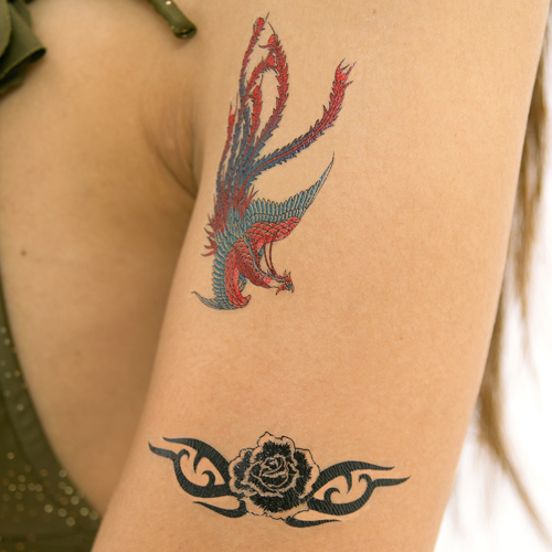 TATTOO(タトゥー)シールで、グッと色っぽく!いつものコスプレ衣装に合わせて、こだわりの箇所に貼り付けるだけ!特殊な素材を使用しているので、皮膚の動きと一緒に伸び縮みします。入浴したり、海やプールに入っても2、3日は取れません!あなたならどこに貼る?SM女王様風に胸元?ほのかにセクシーな首筋?クールに決まる腕?小悪魔ちっくな足首?パーティーに、お祭りに、イベントに、大活躍!あなたの個性で選んでね!