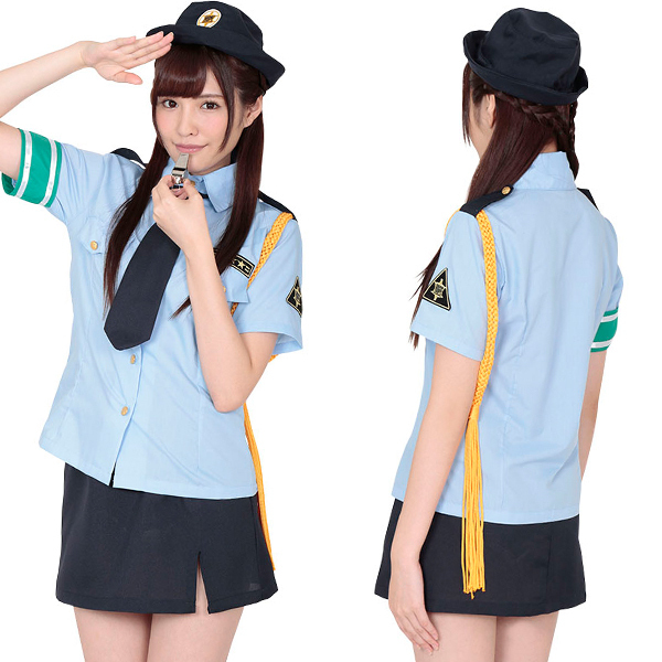 まるで本物と見紛う程リアルな婦人警官のコスチューム。爽やかな清潔感のある水色ブラウスに、スリット入りのタイトなきれい目紺色ミニスカートがセクシー!ネクタイ、腕章、ロープも付いた本格派コスプレ衣装セットです。