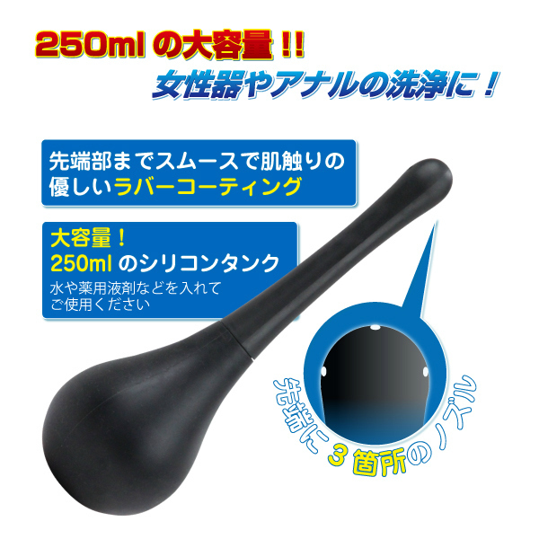 黒くてスタイリッシュ!たっぷり注入、アナルも喜ぶ大容量250mlの洗浄器。全長21.5cm、先端の直径は2.2cm、タンク側の直径は7.3cm!先端が3方ノズルになっているので、ビデとしてヴァギナにもアナルにも使用可能!全体をラバーでコーティングしているので、スムーズに挿入できて安心です。容量250mlのシリコンタンクで、いっぱい洗えて大満足!アナルにも馴染みやすい、洗い不要のCOCOローション(30ml)付き。
