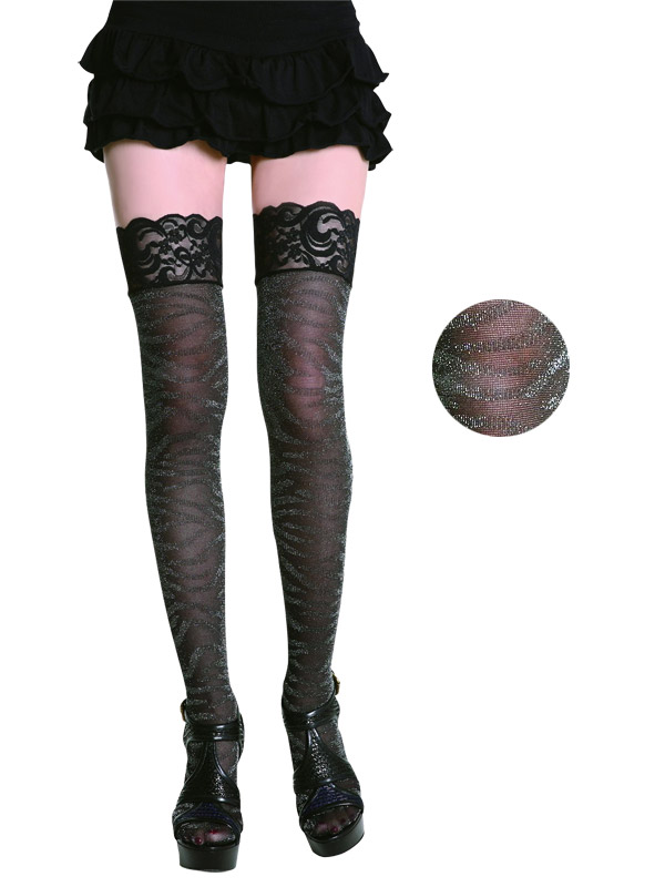 光沢のあるラメ入りのゼブラ柄がインパクト抜群のストッキング。太もも部分は幅広な贅沢レースなので、ガーターベルトとの相性もバッチリ!アニマル柄の中でも人気の高いゼブラ柄で、ちょっぴりワイルドなセクシーさを演出できるストッキングです。