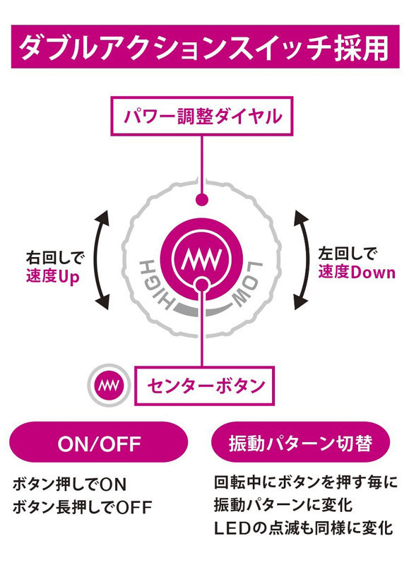 低回転モードでの「弱さ」を極めた驚異のトルクを体感!話題の「絶対イカせる」電マがさらにパワーアップして登場。●細長くなった可愛らしいピンクボディ●ヘッド径は45mmで前作「ピンクデンマ2」と同サイズ●ダイヤルとボタンが一体化したWスイッチ搭載●無段階の強弱コントロール●10種類の多彩な振動パターン●中央ボタン押しで電源ON/長押しでOFF●ダイヤル右回しで加速・左回しで減速●稼動中ボタンを押す度に振動パターン&LED点滅が変化。高度なモーター制御で深みのある低速刺激を実現し、微妙な強弱調整も思いのまま!微振動から激しい高振動までスムーズに操作できます。柔軟なフレキシブルネックと多数の市販アタッチメントを装着できる最もポピュラーな45mmのヘッド径で、様々なアレンジ刺激を楽しめる電動マッサージャーです。※安全の為、15分間以上の連続稼働はおやめ下さい※本体が過度に熱くなった場合は、速やかにご使用を中止して下さい※ご使用後は本体から電池を取り外して保管して下さい