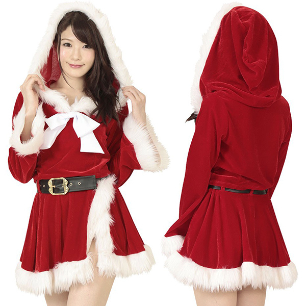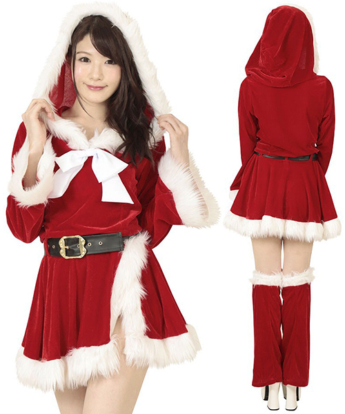 ふんわりファーで雪化粧♪フーディートップス&スカートのラブリーサンタのコスプレセット。●短め丈のセクシートップス●フェイクファーで縁取ったフード付き●大きめのフロントリボンがポイントに●巻きスカートにもファー付き●レッグウォーマーで脚元も可愛く●黒ベルトでウエストマーク。カジュアル&ガーリーなフード付きトップスをヘソ出しのミニ丈にしてセクシーさもプラス!フードを被ってふわふわファーに包まれれば小顔効果もバッチリです。