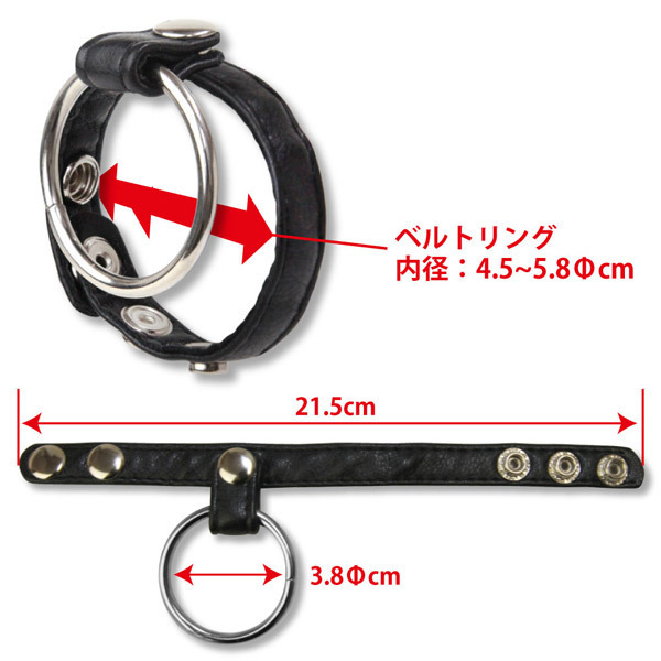 シック&COOLに締め付け!オシャレ男子も唸るハイセンスなレザー調コックリング。●高級感のあるフェイクレザー使用●メタルリングとのダブル締め付け●ベルト部分はスナップボタン採用●内径45〜58mmまでサイズ調節可能●早漏を防いで射精力・男性力UP。見た目にこだわるハイセンスな大人男子も納得!レザー風素材×金属のメタリックなきらめきで紳士らしく仕上げた男性用補助リング。特別な相手にしか見せないリアルな姿をカッコよくCOOLに飾ります。