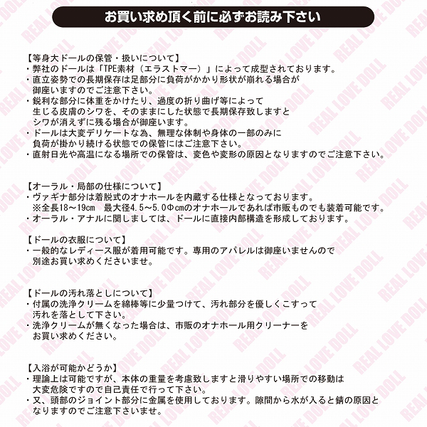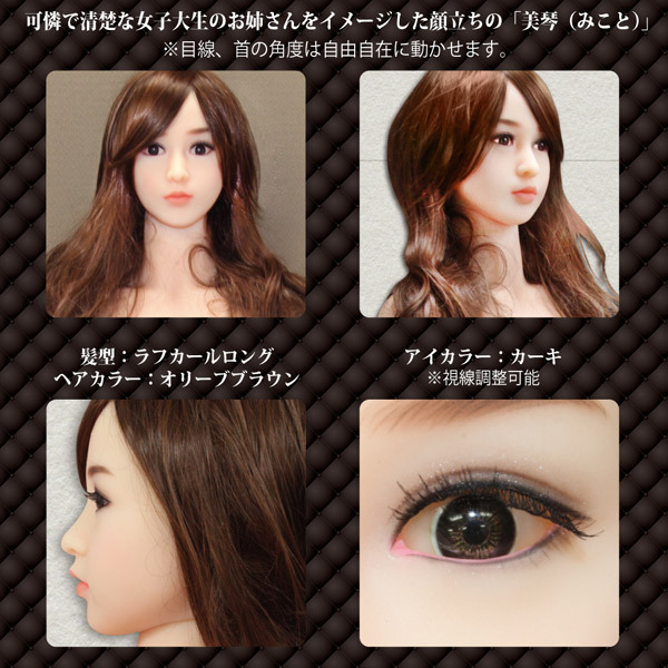 手、足、腰が自在に可動!柔らかな人肌ボディを再現した等身大サイズのリアルラブドール。●清楚な女子大生の美琴●最適限のメイク済みフェイス●ブラウンカラーのロングカールヘア●リアルな人肌感のグラマラスボディ●身長153cm・体重約32kg●B78cm・W56cm・H82cm●一般的な衣類のMサイズを着用可●各関節可動で様々な体位を実現●口はオーラルプレイにも対応●ヴァギナ:付属オナホール内蔵●アナルはドールに直接加工したヒダ構造●視線、首の角度調整も自在。ハイクオリティな究極の嫁を造形した高級リアルドール!オナホールだけでなく、お手入れ用品まで付属した超豪華なフルセット仕様です。※大型商品の為、送料が別途必要になります。