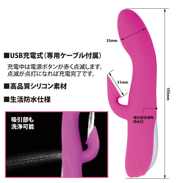 挿入しながら強力バキューム♪クリバイブに吸引機能を搭載した新感覚のバキュームバイブレーター。●肌触り抜群の高品質シリコン●全長19.3cm、最大径は3.5cm●ヘッドに高性能モーター内蔵●角度をつけた先端でG直撃●クリバイブに吸引機能を搭載●唇に吸い付かれるような刺激●強力な12パターン吸引&振動●USB充電式(専用ケーブル付属)●本体は生活防水仕様で衛生的●クリ吸引部分の洗浄も可能。クリ吸引グッズとGスポットバイブが合体!ありそうでなかった画期的なバイブレーター。クリバイブ逆側に排水口が配置されているので、内部までしっかり洗浄できて衛生的です。