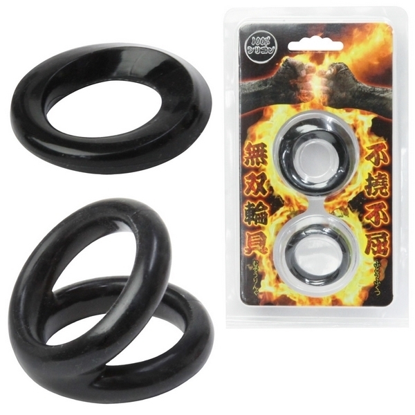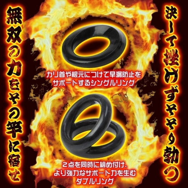 竿に宿る無双の力!シングルとダブルの2タイプがセットになったシリコン製コックリング。●100%シリコン製の柔軟リング●カリ首や根元に最適なシングル●シングルリング内径:2.3φcm●二点を同時に締め付けるダブル●ダブルリング内径:2.6φcm●締め付けで早漏防止をサポート。決して挫けずそそり勃つ不撓不屈のムスコに変身!着け方をアレンジ出来るコックリング2種セット。2種のリングを同時に装着すれば、まさに一騎当千の戦闘力で無双!早漏防止や勃起力UPをサポートする男性用補助グッズです。