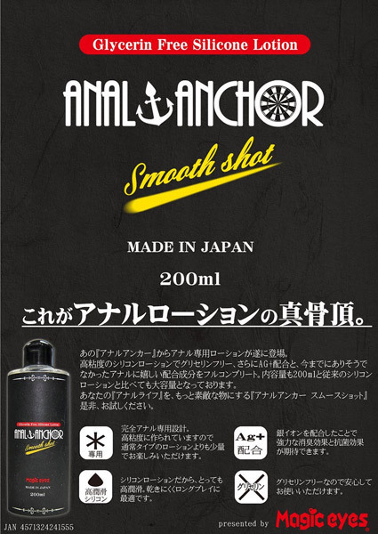 グリセリンフリーで安心!大人気の拡張プラグセット「アナルアンカー」シリーズから、アナル専用のシリコンローションが登場。●高粘度シリコンローション200ml入●安心のグリセリンフリー●抗菌性に優れたAG+配合●ロングプレイに適した高潤滑●少量でも良く伸びて経済的●使い易いワンタッチキャップ。アナルライフをもっと快適に!お尻に嬉しいグリセリンフリー、さらには抗菌・消臭をサポートしてれる銀イオンも配合した高粘度アナルローション。通常のローションに比べて乾きにくいので持ちも良く、継ぎ足しも不要です。