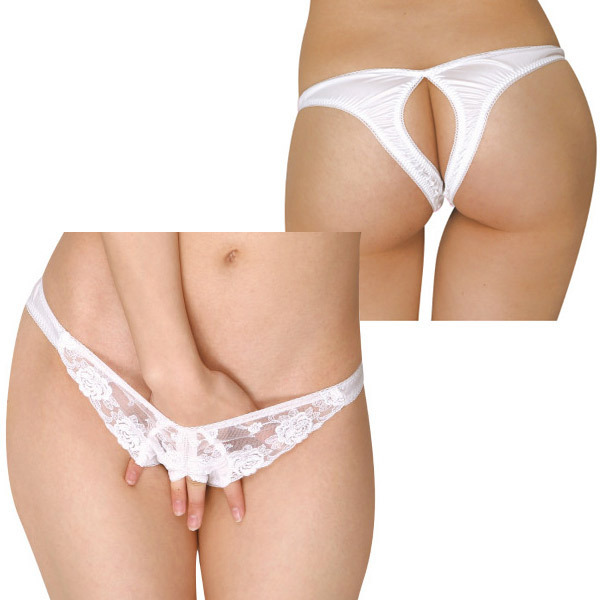 中央でざっくりカット♪セクシー仕上げのヒップオープンショーツ。●ハーフバックデザインショーツ●ホワイトレース×光沢フェリカ地●前から後ろまでオープンカット。透け感が悩ましいエレガントレースと、ヒップのカットデザインで大胆に魅せるオープンランジェリーです。