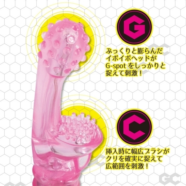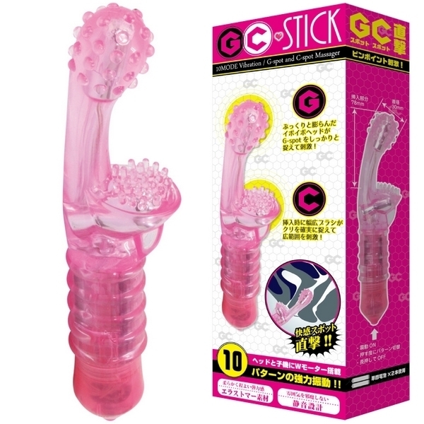 GスポットとCスポットを直撃!快感ポイントを狙い撃ちする悶絶刺激バイブレーター「GCスティック」。●柔らかで丈夫な弾力エラストマー素材●ぷっくり膨らんだイボイボ付きGヘッド●幅広い面で捉えるブラシ突起クリバイブ●先端と子機が振動するダブルモーター●多彩な10パターンのバイブレーション●プレイの雰囲気を邪魔しない静音設計●単四電池×2本使用(動作確認用付属)。快感ポイントを同時責め!オルガスターのようなフォルムのバイブレーター。丸みのあるイボヘッドがGスポットを、幅広ブラシの子機がクリトリスを確実に捉えて広範囲を刺激します。