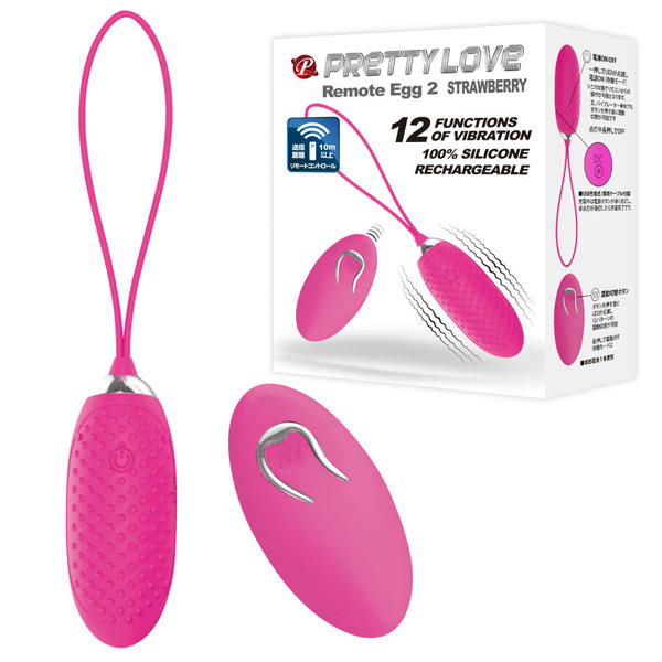 膣の奥へと突き進む強烈振動が特徴のリモコンローター「プリティラブ リモートエッグ2 ストロベリー」。イチゴのような凸凹フォルムのローターは心地良い挿入感の高品質シリコン製。スイッチオンで12種類の多彩な振動パターンと共に、膣の中を突き進む生き物のような動きでGスポやポルチオまで刺激します。最大10mの距離から遠隔操作できるワイヤレス仕様で屋外プレイも楽しめる生活防水&静音設計のストロベリー。本体はUSB充電式(専用コード付属)、フル充電約65分で約46分連続稼働!リモコンは単四電池×1本(別売り)を使用します。