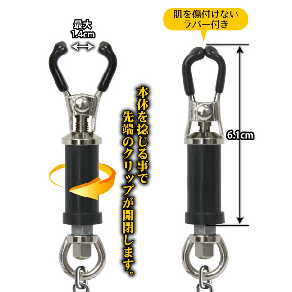 乳首への痛みはやがて快感に…!痛気持ち良いチェーン付きニップルクリッパー「ティッツクラッチ スクリュー」。本体を捻ることでクリップ部分が開閉、締め付け調整も自在!クリップの開閉幅は最大1.4cm、先端はお肌を傷つけないラバー仕様で安心です。2つのクリップを繋ぐチェーンの重みによる負荷で痛気持ち良さも増幅!締め付け具合でソフトからハードプレイまで幅広くお楽しみいただけるSMグッズです。