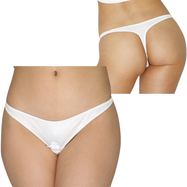 シンプルデザインに秘密の仕掛け♪フロントポケット&ビーズ付きのレディースTバックショーツ。清楚なホワイトカラーのサラリとした光沢フェリカ生地を使用!フロントにちょこんとリボンを飾ったシンプルデザインながら、実はセクシーな秘密の仕掛けが…!クロッチ外側にはリモコンローター等を入れて楽しめる隠しポケット、クロッチ内側には8連のパール調ビーズを配置した大人仕様のランジェリー!女性用Mサイズ、安心の日本製です。※ローターは付属しておりません。