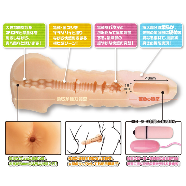 キュッと締まった菊門とリアルなペニスの形がエロさ際立つ♪モチっとした伸縮性をもつエラストマー素材を使用したコチラは、サックとしても使えるよう先端が硬質素材仕様となった特殊な非貫通型ホール。お尻の穴の先はサオをゴリっと刺激するイボゾーンや、亀頭と裏筋にゾリゾリ刺激を加える横ヒダ空間、亀頭を咥え込み集中刺激する肉突起ゾーンを配置し、緩やかな快感でフィニッシュまで導きます♪先端部にはローターを装着することも出来るため、市販のローターをプラスして亀頭へ快感振動を与えることも可能!1つで多様な楽しみ方をしていただけるホールとなっています♪ローション付属