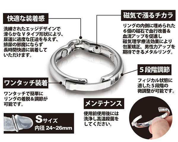 包茎や持続力など男性特有の悩みをサポートする男性補助アイテムならコチラ!内径およそ2.4cm〜2.6cm、洗練された美しいデザインでありながら磁石のパワーで血行を促したり包皮をまとめるなど、男性の自信を取り戻すべくしっかりと働いてくれるのがこのペニス増強グッズ。尿道を締めすぎないよう設計されているため長時間にわたっての装着も可能ですし、トイレの際に邪魔にならないのも嬉しいポイント!さらに金属製というだけあって煮沸消毒もOKなので常に清潔状態をキープできますよ♪