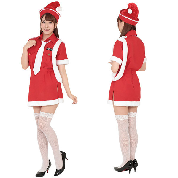 聖なる夜は婦人警官もクリスマス気分♪赤×白カラーの可愛いクリスマス衣装。深めのスリット加工が施されたミニスカートと赤のシャツほか、ポンポン付きサンタ帽とネクタイが付いたお得な4点セットです♪