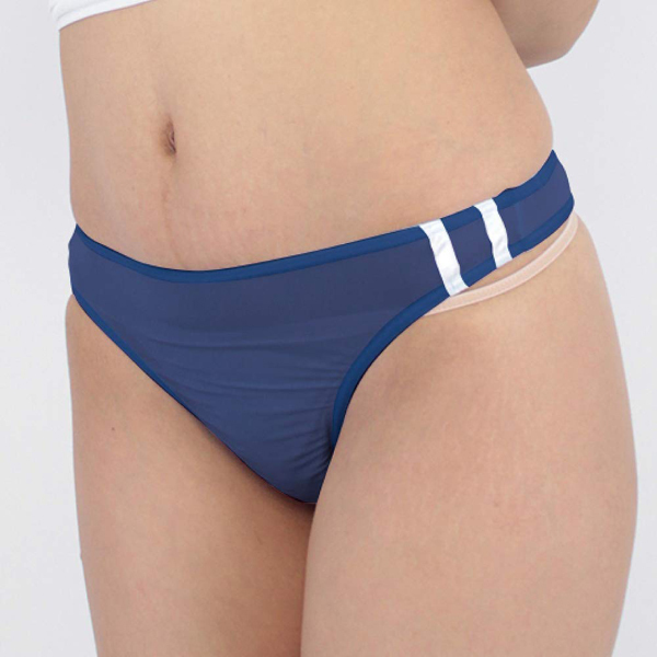普段着でもブルマを取り入れたい方は是非どうぞ!2本の白ラインが入ったネイビーカラーのブルマ風Tバック(日本製)。素肌が透けて見えるほどの極薄生地で懐かしい体操着をセクシーに仕上げたTバック仕様のブルマ♪二人の夜を盛り上げる一枚に。