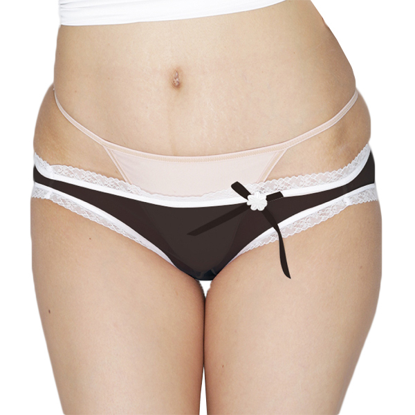 素肌が透けて見える黒の極薄生地を白レースで飾った日本製フルバック。色気たっぷりなシースルー生地のフロントに、白の花飾りをつけたリボンをあしらいフェミニンに仕上げた一枚です♪