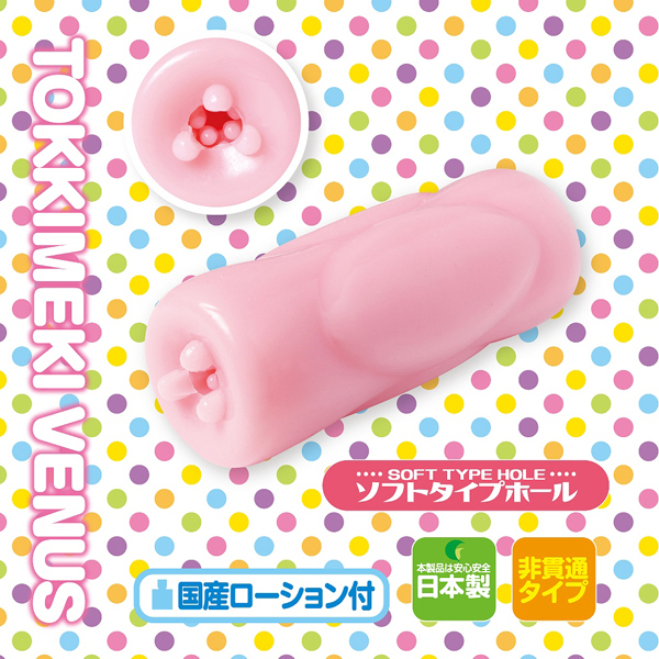 イボのプリプリ感がクセになる、ソフトタイプホール「とっきめきヴィーナス」。根本をグリグリしっかりと刺激し、上下の動きに同じ刺激を!せまい入口をぬけると、斜めイボヒダで亀○とウ○スジににゅるにゅる感触。2種類のイボで亀○FINISH♪イボイボ突起のひっかかり感がヤバい!締まりと複数の高刺激イボイボが特徴の非貫通オナホです。