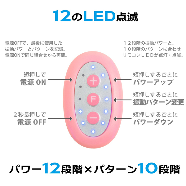 10m先まで操作可能!遠隔プレイ好きのための可愛いリモコンローター(USB充電式)。12段階のパワフル振動×10種類の振動パターンでおよそ120種もの快感による完全支配!リモコンにはパワーや振動が解りやすいLEDを12個を搭載、5分で自動的にOFFになる一時停止機能も完備しています。完全防水&静音設計※リモコンには電池を内蔵