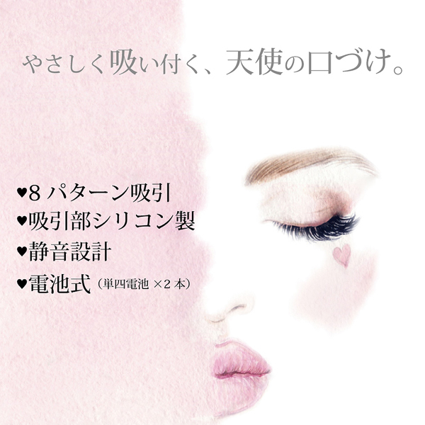 「優しく吸い付く、天使の口づけ」柔らかなシリコンがピンポイントに刺激する電池式の吸引ローター。手にフィットしやすい滑らかな曲線形状と、ロングプレイでも疲れにくい軽量ボディ設計!8種類の豊富な吸引パターンと、天使のようにふんわり優しい質感の吸引口が貴女を極上の世界へと誘います。単4電池を2本使用