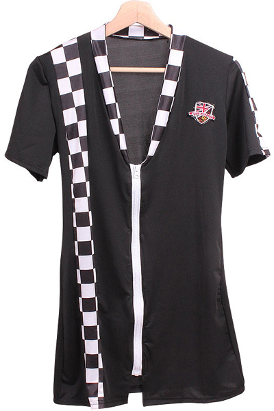 デコルテラインを美しくアピール!白黒のチェッカー柄が格好いいミニ丈ワンピのレースクイーン衣装。胸元には国旗柄のお洒落なワッペンを飾り付け♪着脱しやすいフロントジッパー式※こちらの商品は受注発注商品の為、ご注文から発送までに3、4営業日掛かる場合が御座います。