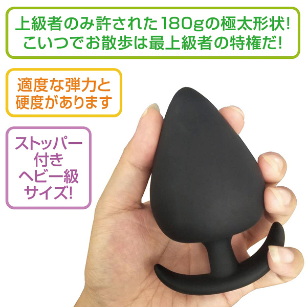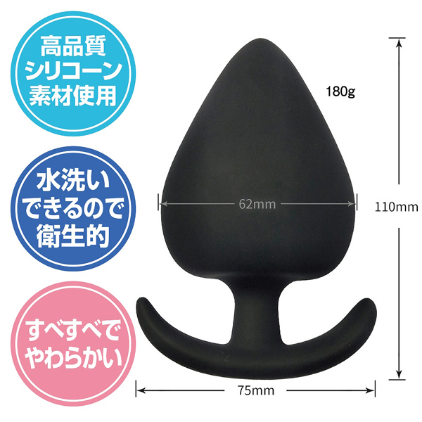 全長11cm、最大幅6.2cm!お尻の中を圧迫刺激する超特大180g仕様のストッパー付きプラグ。上級者にのみ許されたヘビー級サイズ!すべすべと滑らかで適度な硬度&弾力の高品質シリコンを使用。