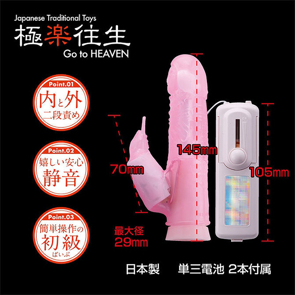 手頃に使えるハンディサイズで気持ちいいところを内外から同時に責められるシンプルバイブ「極楽往生」。20年以上に渡り、世のエロ紳士・エロ淑女に愛されるデザインで操作もシンプルなスライドボタンの強弱タイプ!機能面としてはスイングによる回転が膣のナカを、サブのバイブがクリを振動刺激するというイカせ上手なバイブとなっております♪内側のスイング機能はパワフルで圧力に負けない力強さがあり、外側の舐めるタイプのクリバイブは細かな振動で確実に昇天へと導いてくれるでしょう。