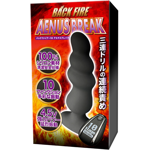 奥へと誘うツイスト形状と10種類のバイブパターンが自慢の「バックファイアー10(アエナスブレイク)」です。単四電池を3本使用した4.5Vの強力パワーに10ファンクションシステムを搭載!100%シリコンの電動アナルプラグで強力な振動と独特な形状が嫌というほど攻めまくる♪アエナスブレイクは3連続の山の形状がほじくるようなドリル責めを実現!強烈な快感を引き起こしながら、振動とともに無限大の恍惚と快感を与えてくれます♪先端のヘッドはするっと入りやすく、3連続のマウンテン構造がドリルのようにねじり込みながら、ほじくる快感を味わわせてくれます。