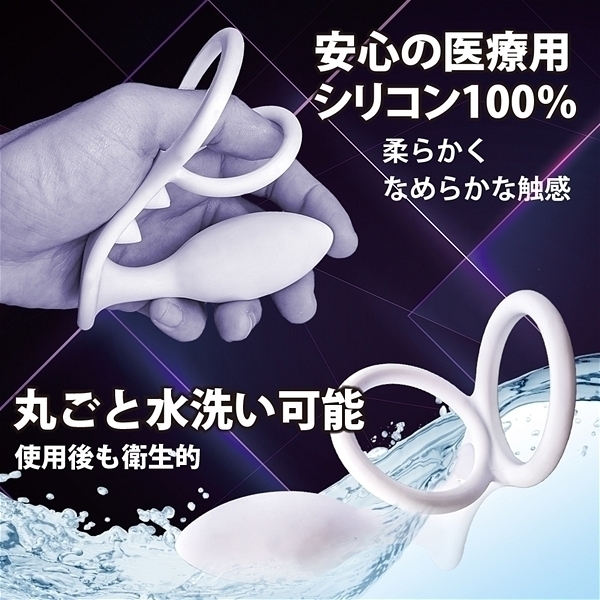 前立腺刺激と会陰部の圧迫、ペニスの締め付けで射精感UP!2つの突起が会陰部を刺激し、射精感を更にUP!根本、睾丸、会陰部、前立腺の4か所を同時に刺激!100%医療用シリコン素材。