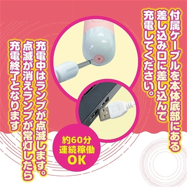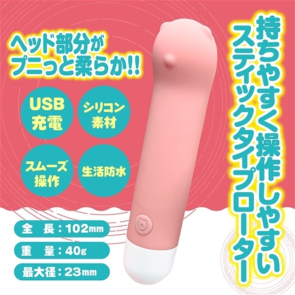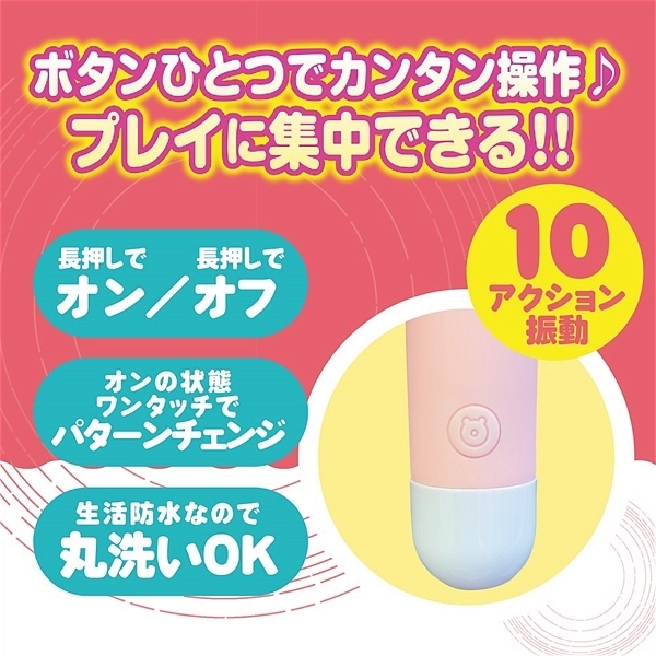 超軽量シリコンローターのベアーは、かわいい形だけでなく10モードのアクション振動とヘッド部を押しつけても痛くないシリコン素材を採用している柔らかローターです。1ボタンの簡単操作と丸洗いOKの生活防水もあり清潔に保管して頂けます。USBでの簡単充電で最大60分の連続使用も可能。