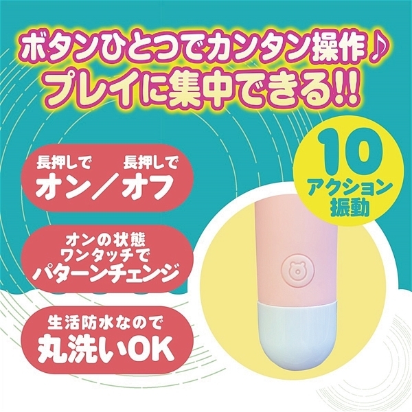 超軽量シリコンローターのマッシュは、かわいい形だけでなく10モードのアクション振動とヘッド部を押しつけても痛くないシリコン素材を採用している柔らかローターです。1ボタンの簡単操作と丸洗いOKの生活防水もあり清潔に保管して頂けます。USBでの簡単充電で最大60分の連続使用も可能。