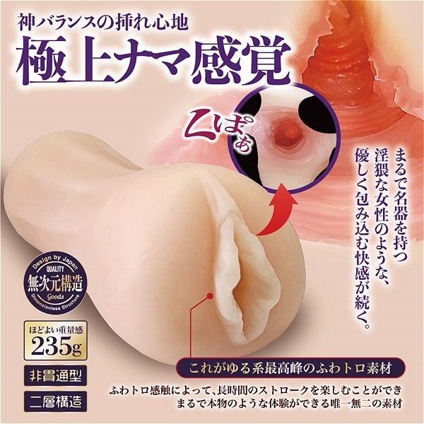 ふわトロとぐちょ濡れ名器のコラボレーション。ゆるふわな感触により長時間ストロークを楽しむ「ふわトロ」と有機的な内部構造で搾り取る「ぐちょ濡れ名器」のリアル感。淫猥は横ヒダとイボの肉壁バランスが良いふわトロ素材との相性を考えたバランス構造。80ml本気汁付属