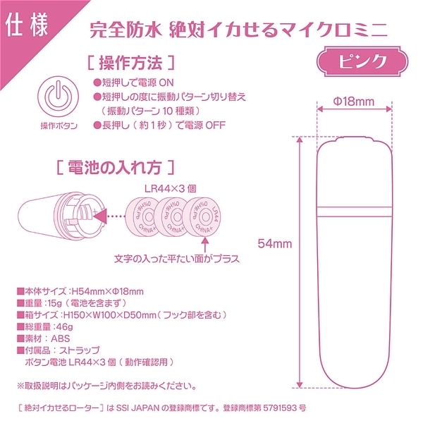 あの絶対イカせる極小ローターが完全防水(IPX7)に大変身!完全防水(IPX7)になって新登場。どれだけ濡らしても安心で、お楽しみ後は丸洗いOK。振動パターンは、なんと10種類!大人の親指くらいしかない超マイクロサイズなのに、とってもハイパワー。しかも超静音設計●素材:ABS●防水レベル:完全防水(IPX7)●カラー:ピンク