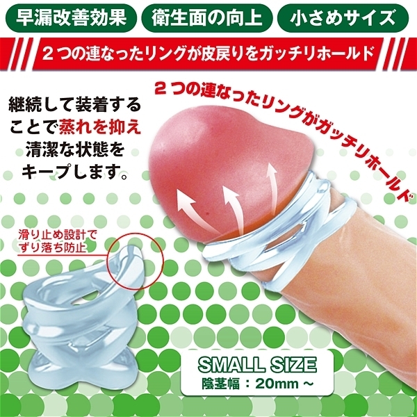 2つの連なったリングが皮戻りをがっちりホールド!継続して装着することで蒸れを抑え、清潔な状態をキープします。又、外的刺激に慣れることで早漏改善も期待できます。安全かつ高品質なTPE素材を使用しており、洗浄もしやすく衛生的にご利用いただけます。●早漏改善効果●衛生面の向上●小さめサイズ<ご使用方法>@包皮を剥き亀頭を露出させる。Aリングの開いている部分が裏筋を挟むように装着する。B包皮を伸ばしたまま残りのリングを巻きつける。2 CONNECT