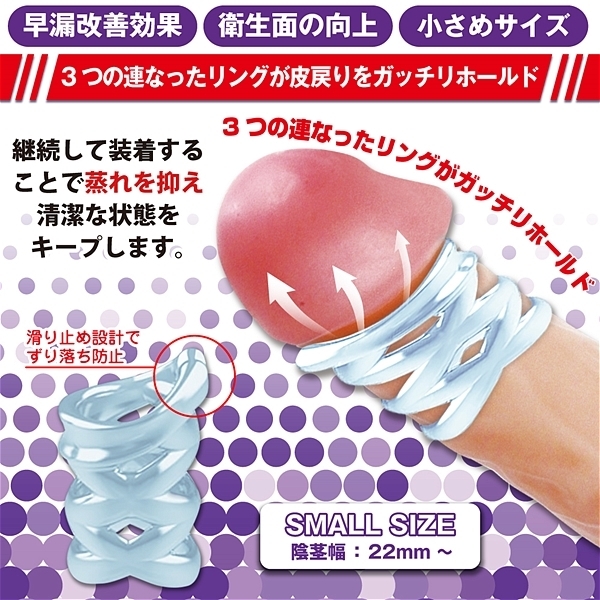 3つの連なったリングが皮戻りをがっちりホールド!継続して装着することで蒸れを抑え、清潔な状態をキープします。又、外的刺激に慣れることで早漏改善も期待できます。安全かつ高品質なTPE素材を使用しており、洗浄もしやすく衛生的にご利用いただけます。●早漏改善効果●衛生面の向上●小さめサイズ<ご使用方法>@包皮を剥き亀頭を露出させる。Aリングの開いている部分が裏筋を挟むように装着する。B包皮を伸ばしたまま残りのリングを巻きつける。3 CONNECT
