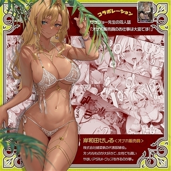 サゲジョー先生の同人誌「オナホ販売員のお仕事は大変です!」とのコラボレーション。登場キャラの岸和田セシルを再現したグッズの登場。いやらしい褐色のボディにクリムゾンの膣内、興奮したGスポットがキツキツでお出迎え、膣内に出して欲しくてウズウズしてる子宮口。ずっしり660gのMagiceyesスキンで岸和田せしるをご堪能下さい。