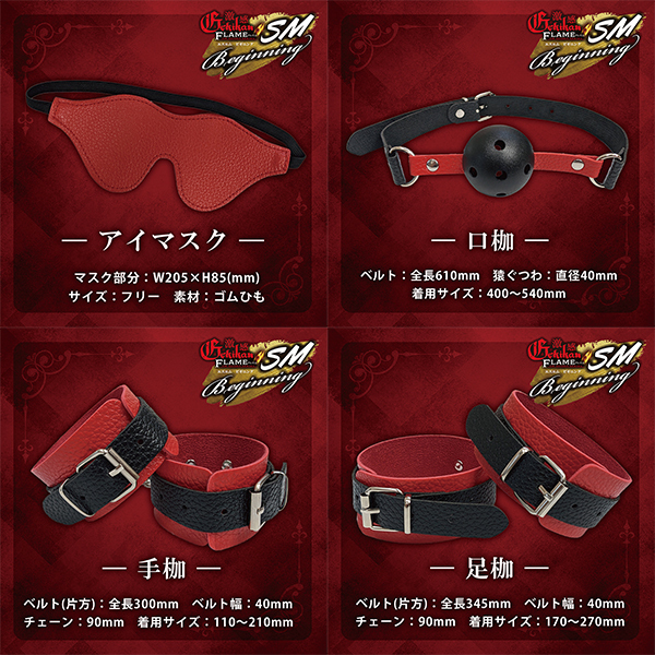 It’s Show Time!SMショーのはじまり、はじまり。豪華絢爛なSMスタンダードアイテム7点セット。漆黒と真紅の二色で織りなす、愉悦と快楽の時間が訪れる。◆アイマスク視界を塞がれ、研ぎ澄まされる感覚。肌に当たる面は、柔らかなベロア風。ゴムひもでどなたでも着用できます。◆口枷開口の自由を奪われるも、その表情は歓喜に満ちる。ベルト式の留め具になっており、サイズは7段階に調節可能。◆手枷・足枷SMの入口ともいえる手枷・足枷。チェーンは取り外し式。ベッドの柱に通すときも簡単。手と足で拘束することも可能。肌に当たる面は、柔らかなベロア風で痕も残りにくい設計。◆首輪(リード付)リードで繋がれることで、主従関係が明白に。首のベルトは6段階に調節可能。リードは首輪本体から取り外しできます。肌に当たる面は、柔らかなベロア風で痕も残りにくく安心。◆拘束ロープロープ間から体躯のなまめかしい肉感が、更なる背徳感を呼び起こす。縄を絞めたときの達成感を味わうのも、SMならでは。動けない身体をじっくり視姦する。◆バラ鞭その刺激がやがて快感へと変わっていく…。持ち手には手首通しが付いてるため、初心者にも扱いやすくプレイ中もすり抜ける心配なし。
