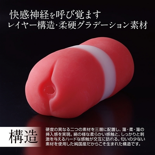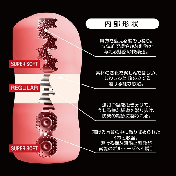 靡唇は硬度の異なる二つの素材を三層に配置し、蕩・柔・蕩の挿入感を実現しました。絹の様な柔らかい感触と、しっかりと刺激を与えるハードな感触が交互に訪れます。また内部構造は立体的なひだのうねりで刺激を与える入り口部分。波打つようなヒダの細道が特徴的な中間部。イボと吸盤がしっとりと射精へと導く最奥部。これらは快感を高めるために考えられた構造になっています。