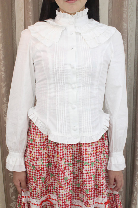 お姫様気分が盛り上がるたっぷりフリル!クラシカルな世界観を楽しめる純白ブラウス単品(BIG)。立襟のフリルがとっても可愛く、肌触りが良いので着心地も良好!バックはシャーリング入りの編み上げになっており、ゴスロリやコスプレ衣装とも相性抜群!一枚は持っておきたいキュートなブラウスです。※水洗い不可、塩素系漂白剤による漂白不可、アイロンは中温で当て布使用、ドライクリーニング可、色落ちの可能性があります。※こちらの商品は在庫の状況によりお届けまでに4日〜7日程度かかる場合がございます。