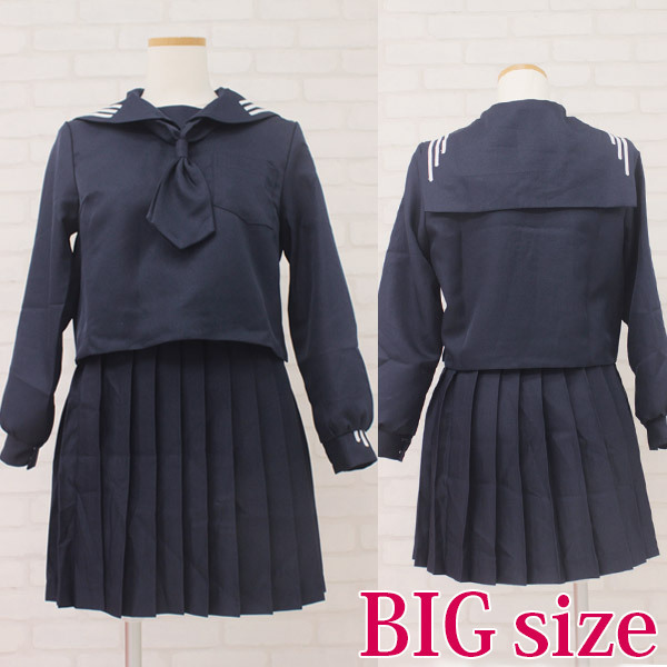 独特の3本ラインがポイントになった、私立女子学園の冬服セーラー服(BIG)。長袖セーラーブラウス、プリーツスカート、紺色スカーフのセット!セーラー襟と袖に入った、個性的な白ラインがお洒落なお嬢様風制服コスプレです。※水洗い不可、塩素系漂白剤による漂白不可、アイロンは中温で当て布使用、ドライクリーニング可、色落ちの可能性があります。※こちらの商品は在庫の状況によりお届けまでに4日〜7日程度かかる場合がございます。