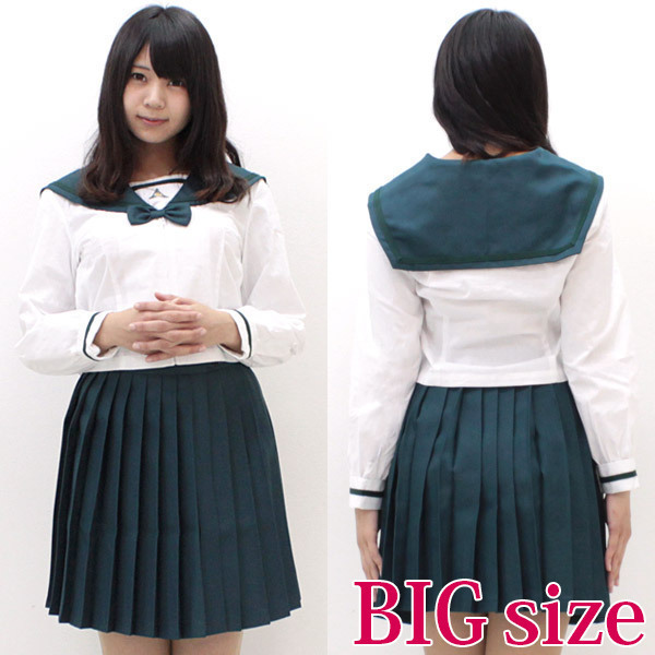 黒でも紺でもない落ち着いた緑色が新鮮!白い部分とのコントラストが映えるセーラー服。夏の暑い時期には、長袖制服だってスッキリ着たい!おとこの娘もOKなBIGサイズ、人気私立のキュートでセクシーなセーラー服コスチュームです。※水洗い不可、塩素系漂白剤による漂白不可、アイロンは中温で当て布使用、ドライクリーニング可、色落ちの可能性があります、ご注意ください。※こちらの商品は在庫の状況によりお届けまでに4日〜7日程度かかる場合がございます。