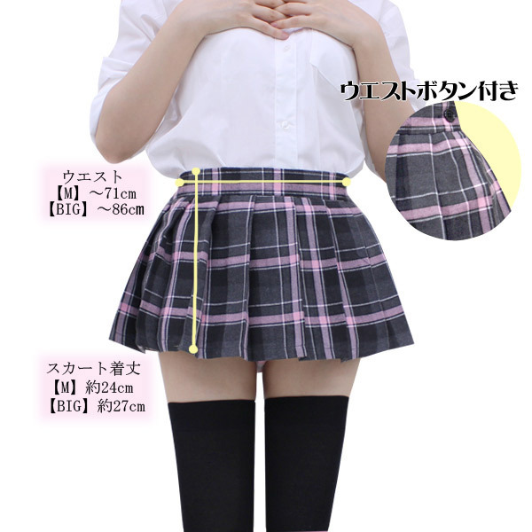 見えそうで見えないギリギリ感にドキドキ!超マイクロミニ丈のチェックスカート。●丈27cmの超ミニプリーツスカート●黒×グレー×ピンクのチェック柄●ウエスト〜86cmのBIGサイズ●サイドファスナー&ボタン留め●ウエスト後ろ一部ゴム仕様。ベーシックカラーの黒&グレーと、華やかピンクを組み合わせたチェック柄が大人可愛いミニスカート!お気に入りの見せパンと合わせて履きたいスクール制服コスチュームです。※水洗い不可、塩素系漂白剤による漂白不可、アイロンは中温で当て布使用、ドライクリーニング可。