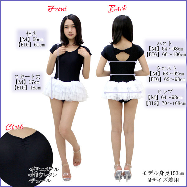 HOME > 衣装・コスチューム > バドガール・レースクィーン > チュールスカート付き半袖レオタード(後ろリボン) 黒×白 M