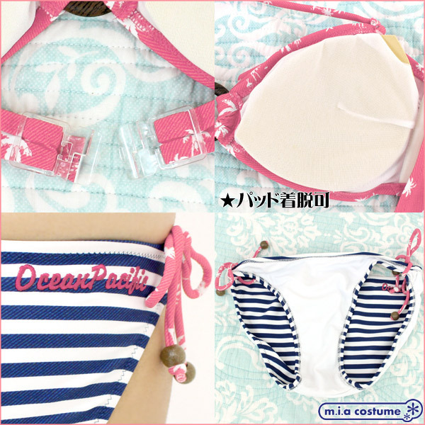 11Lサイズ:B86cm・H87〜95cm セット内容:トップス(パッド着脱可、ワイヤー無し)、ビキニショーツ 素材:ポリエステル85%、ポリウレタン15% 生産国:日本