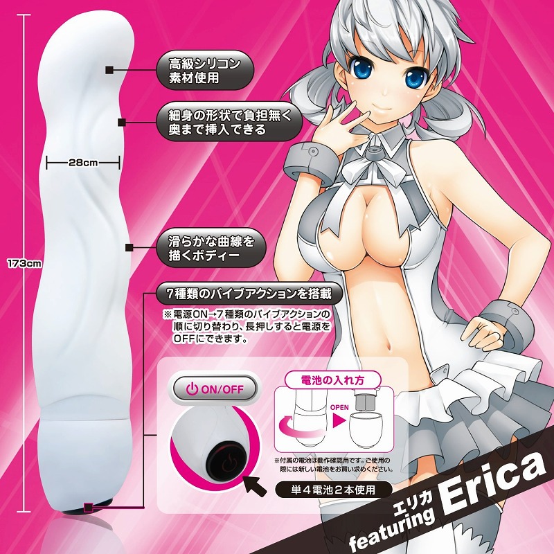 高級シリコンを採用したエキサイトシリーズのバイブレーター。清潔感のあるホワイトカラーの本体は、パッケージモデル「Erica」の細身ボディを再現!滑らかな曲線と細身の形状で、カラダに負担を与えることなく奥まで挿入が可能!使い方は簡単、、底に付いたスイッチを押す度に振動が切り替わり、長押しで電源OFF!計7種類の振動が刺激と快感を与えます。初心者の方でもお使い頂けるバイブです。単4電池×2本使用。