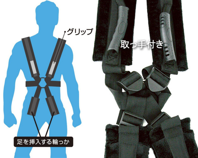 どこでも簡単に駅弁プレイが楽しめるお手軽サポーター、ELock。かなりの体力を必要とする駅弁ですが、これならラクラク!リュックを背負うように男性が装着し、輪に女性の足を通すだけ。ウレタンを使用した肉厚な作りで、痛みや痕残りを軽減。持ち手もついて女性の安定感もバッチリです。便利な拘束具で、いつもの単調なプレイに刺激を加えてみましょう。