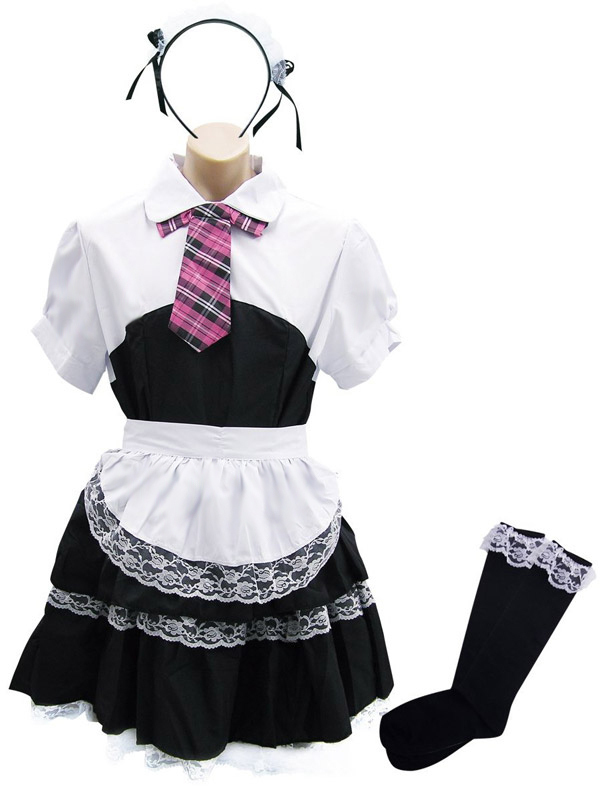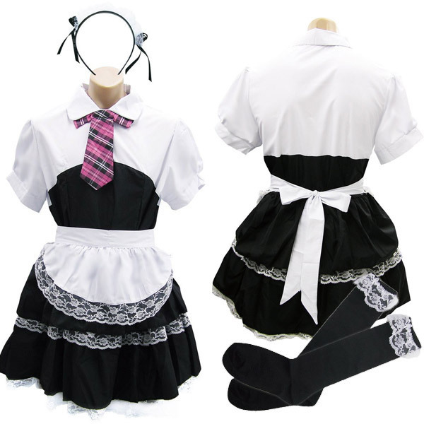 男の娘待望、メンズフリーサイズ!桃色ネクタイが超可愛い、メイド服コスチューム。レース飾りがお洒落なシャツ一体型ワンピース、フリルエプロン、チェックのネクタイ、サイドリボン付きカチューシャ、黒ハイソックスの豪華5点セット!憧れのメイドさんになれちゃう、セクシーコスチュームです。
