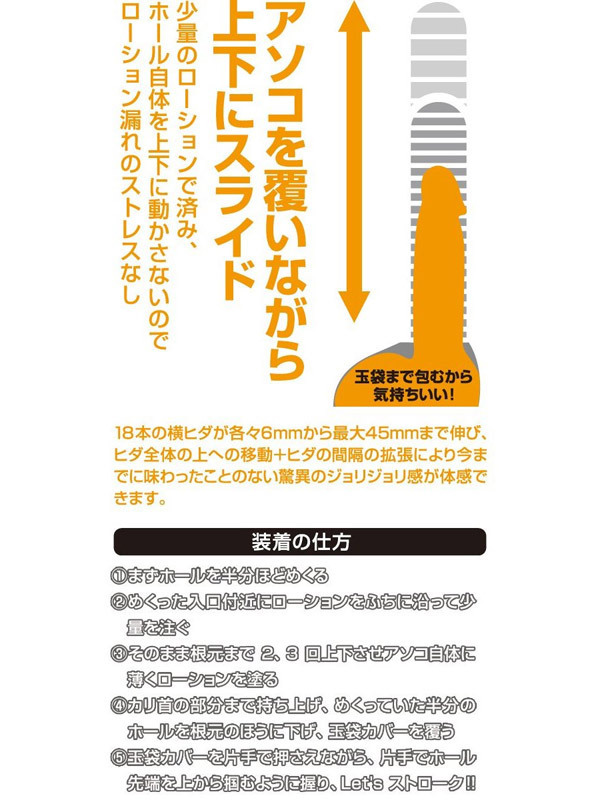 驚愕、メチャ伸び!亀頭の先から玉袋まで包み込んでスライドさせる、白いシリコンオナホール。ショリショリ刺激がたまらない!シンプルな超伸縮ヒダ系オナホール(非貫通型)です。ヒダ数が多いから、ローションが少量でもすぐ馴染み、漏れも極力防止します。装着後は根元を固定しつつ、利き手で上下にグラインド!刺激に弱いペニスのトレーニングとしても最適です。