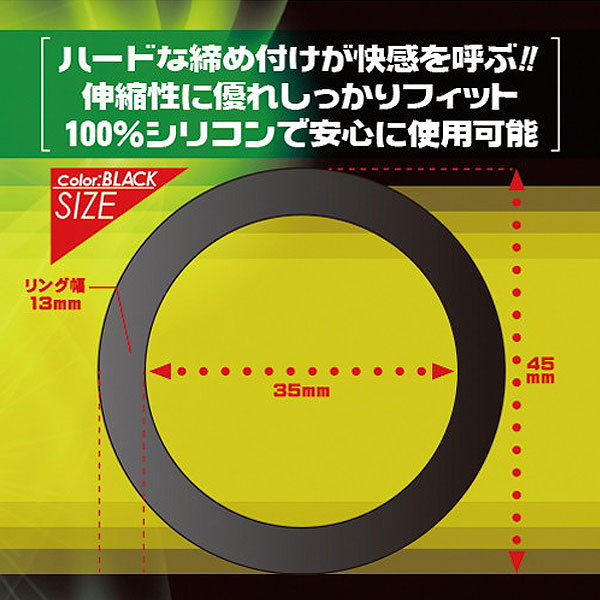 リングの厚み13mm!ハード系シリコンでギュッと締め付ける、シンプルなブラックコックリング。竿と玉袋を通してペニスの根元から締め付ける!φ35mmの内径、適度な伸縮性を持ち、様々なムスコにフィットしてくれます。パートナーとのセックスやオナホールを使った自慰にて使ってみてください!硬く勃起したペニスは、いつもより感じやすくタフになっているはずです。